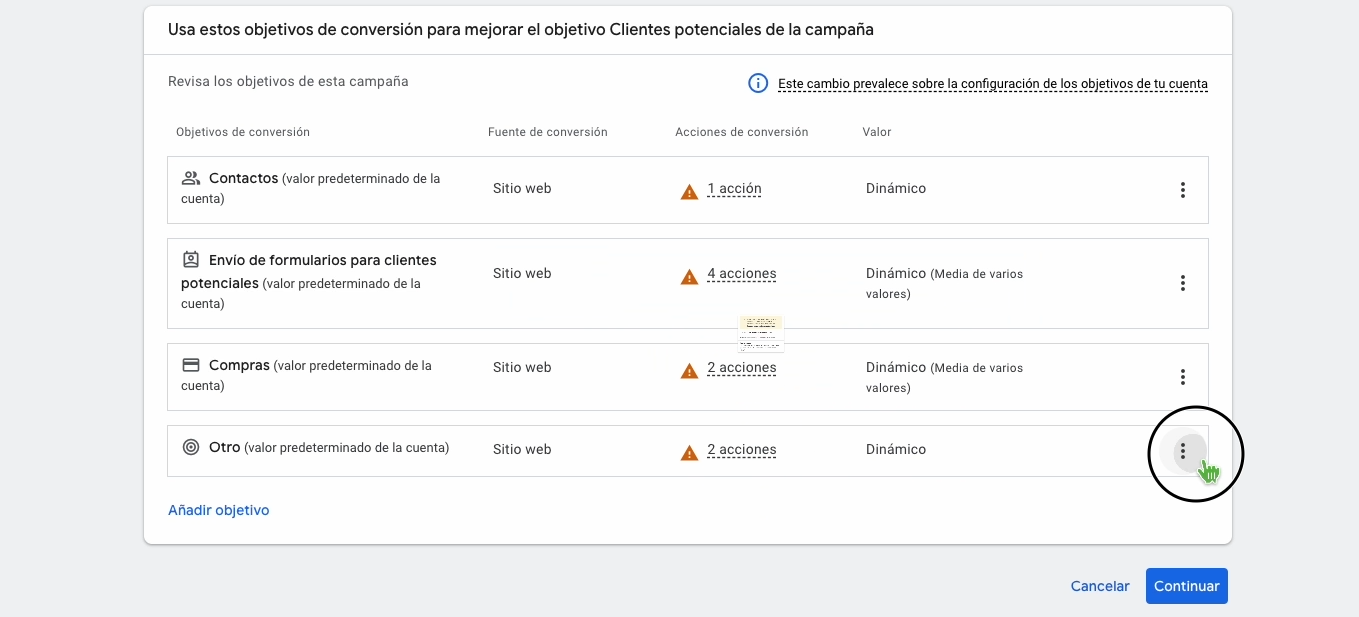 Por ejemplo, si me quiero enfocar solo en el envío de formularios para clientes potenciales. La metodología es sencilla. Debo quitar los objetivos que no utilizaré para esta campaña, haciendo clic ‘En los tres puntos a la derecha’ y lo vamos eliminando. Esto no los elimina de mi cuenta, simplemente significa que Google no los tomará en cuenta para su estrategia de puja. Una vez que tengamos esto, hacemos clic en ‘Continuar’.